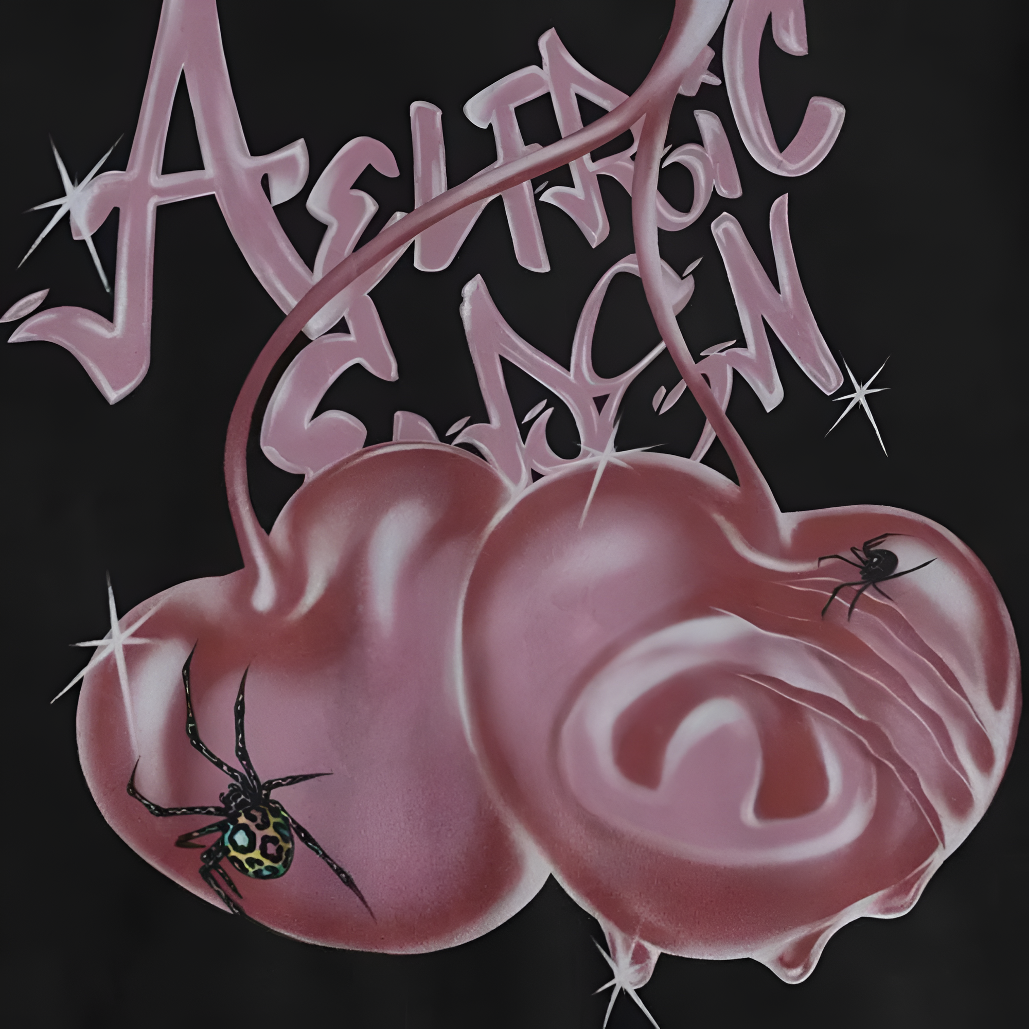 The design features bold graphics—spiders and cherries arranged into a pattern that adds interest from every angle. These visuals contribute to the garment's aesthetic direction without overwhelming its structure. The dark styling makes it suitable for individuals who lean toward minimal color use and layered compositions.